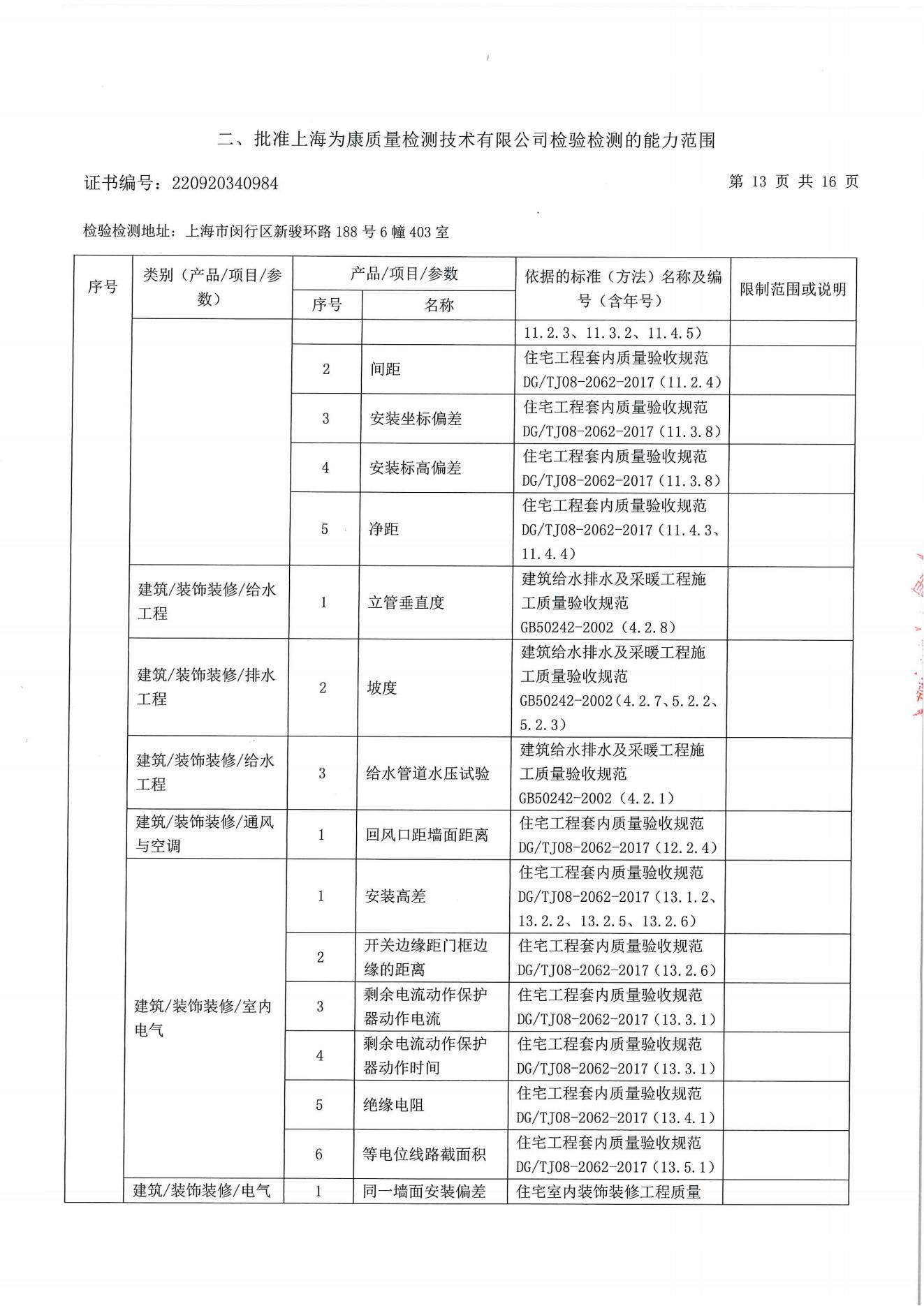 隨著經濟技術的發展,人們生活水平的提高,人們逐漸要提高和改善自己的居住和工作環境,在對居 住環境、辦公樓進行裝飾裝修時必然要采用大量的建筑和裝修材料,在美化室內環境的同時也帶來了 大量的污染物,這些室內環境中存在的污染物具有成分復雜、低濃度、接觸時間長、影響人群眾多和 產生健康影響的效應潛伏期長等特點。 為了保護室內人群的身心健康和促進員工的工作效率,國內外各單位和機構投入大量精力和財力進行 研究和實施達到室內人群可接受的室內污染物水平的措施和管理程序,為創造良好的樓宇室內環境質 量,針對室內污染的控制要素主要有:物理性指標、化學性指標、生物性指標和放射性指標四大類, 各主要要素的控制限值詳見下表(摘自《室內空氣質量標準》): 服務范圍: 1、個人家庭新房裝修污染空氣檢測。 2、學校、幼兒園等公共場所空氣檢測。 3、辦公室室內空氣污染檢測、甲醛檢測。 檢測依據及相關規定: 檢測依據:GB/T18883-2002《室內空氣質量標準》 檢測內容及限量標準: 室內環境質量評價標準 污 染 物 級 別 類 別 項 目 單 位 一 級 二 級 三 級 物理性指標 可吸入顆粒物 μg/m3 50 150 250 溫度 ℃ 23-26 23-26   21-23 21-23   濕度 % 50-60 55-65   40-50 >≤40   空氣流速 m/s <0.2 <0.25 <0.3 <0.15 <0.2 <0.2 噪聲 dB ≤45 ≤55 ≤65 ≤30 ≤45 ≤60 新風量 m3/h.人 60 30 15 化學性指標 甲醛 mg/m3 0.04 0.08 0.12 苯 μg /m3 10 20 30 二甲苯 mg/m3 0.03 0.60 0.90 TVOC μg /m3 200 300 600 苯并(α)芘 ng/m3 不得檢出 1 2 氨 mg/m3 0.1 0.2 0.5 CO2 ppm 600 1000 1500 CO mg/m3 3 5 10 O3 mg/m3 0.10 0.12 0.16 SO2 mg/m3 0.15 0.15 0.25 NO2 mg/m3 0.10 0.10 0.15 生物學指標 細菌總數 cfu/m3 1000 2000 4000 放射性指標 氡及其子體 Bq/m3 100 100 200 檢測周期: 自進場采樣后4-6工作日出具加蓋CMA(檢驗檢測授權專用章)檢測報告,具體報告周期視檢測量 及客戶實際要求為準。 檢測報告內容: 最終檢測報告包括以下內容: 1、工程概況; 2、檢測方法采用標準; 3、檢測使用設備; 4、檢測結果數據; 5、檢測報告編制、審核、批準人員信息; 6、檢測專用章及國家檢驗檢測機構授權專用章。 三、套內質量檢測(一房一驗) 分戶驗收要求 分戶驗收:即交房前依照相關標準對區域內住宅逐套進行驗收。自2009年10月1日起所有上海市 住宅工程強制實施分戶驗收。《上海市工程質量分戶驗收管理規定》住宅工程竣工驗收前必須依照《住 宅工程套內質量驗收規范》DG/TJ08-2062-2009和現行工程質量標準、規范,對每戶套內的觀感質 量、使用功能及使用安全進行驗收。凡未實施分戶驗收的,該工程項目將不得交付使用; 服務范圍 一、裝修房全過程跟蹤檢查:從毛坯到裝修結束全過程跟蹤檢驗;對隱蔽工程施工進行檢測;對裝飾 材料進行控制;每個施工節點作好原始記錄并提出整改意見;待整改結束進行復查,直至符合 要求;最終每戶出具一份檢測報告。 二、裝修房竣工驗收:主要對安全、使用功能及表面觀感質量進行檢測;每個施工節點作好原始記錄并提出整改意見;待整改結束進行復查,直至符合要求;最終每戶出具一份檢測報告。 三、毛坯竣工驗收:主要對安全、使用功能及表面觀感質量進行檢測;每個施工節點作好原始記錄并提出整改意見;待整改結束進行復查,直至符合要求;最終每戶出具一份檢測報告。 四、個人交房驗房檢測。 建設工程分戶驗收檢測參考標準 DG/TJ08-2062-2017 《住宅工程套內質量驗收規范 》 DB/T 31/30-2003《住宅裝飾裝修驗收標準》 GB50209-2002《建筑地面工程施工質量驗收規范》 GB50210-2001《建筑裝飾裝修工程質量驗收規范》 GB20242-2002《建筑給排水及采暖工程施工質量驗收規范》 GB50300-2001《建筑工程施工質量驗收統一標準》 GB50303-2002《建筑電氣工程施工質量驗收規范》 套內質量檢測(一房一驗)內容 檢測內容 建筑尺寸 室內地面:水泥砂漿地面、木、竹地板,板塊地面 室內頂棚:頂棚抹灰、吊頂工程 室內墻面:墻面抹灰、飾面板(磚)墻面、涂飾工程、裱糊工程、軟包工程 建筑門窗 樓梯與護欄 細部工程:櫥、柜,窗簾盒、窗臺板、門窗套、可折裝式隔斷、淋浴房 給排水與燃氣:室內給水、室內排水、衛生器具、燃氣管道 通風與空調:送排風和防排煙、空調工程、 室內電氣:燈具安裝、開關、插座,分戶配電箱、室內配線、等電位聯結 弱電工程:有線電視安裝工程、電話、信息網絡安裝工程,訪客對講安裝工程、安防報警系統 太陽能熱水系統 室內環境評價 四、空調與通風系統檢測 1、服務范圍 通風與空調系統風系統、水系統檢測; 通風與空調機組各功能段性能檢測; 通風與空調管道性能檢測; 空調房間室內環境檢測; 通風與空調系統節能性評價,通風與空調系統報監檢測。 2、檢測依據 GB50411-2007 《建筑節能工程施工質量驗收規范》 GBT19232-2003 《風機盤管機組》 GBT14294-1993 《組合式空調機組》 DG/TJ08-802-2005《通風與空調系統性能檢測規程》 DG/TJ 08-802-2005《通風與空調系統性能檢測規程》 GB 50243-2002《通風與空調工程施工及驗收規范》 GB 50411-2007《建筑節能工程施工質量驗收規范》 3、通風與空調系統檢測注意事項 1、通風與空調系統檢測進場前須要提供設計說明圖紙、主要設備參數表、風管、風口、水管布置圖; 2、通風與空調系統檢測進場前,系統應運行穩定一段時間,標準時間8小時,適當可減少; 3、通風與空調系統檢測